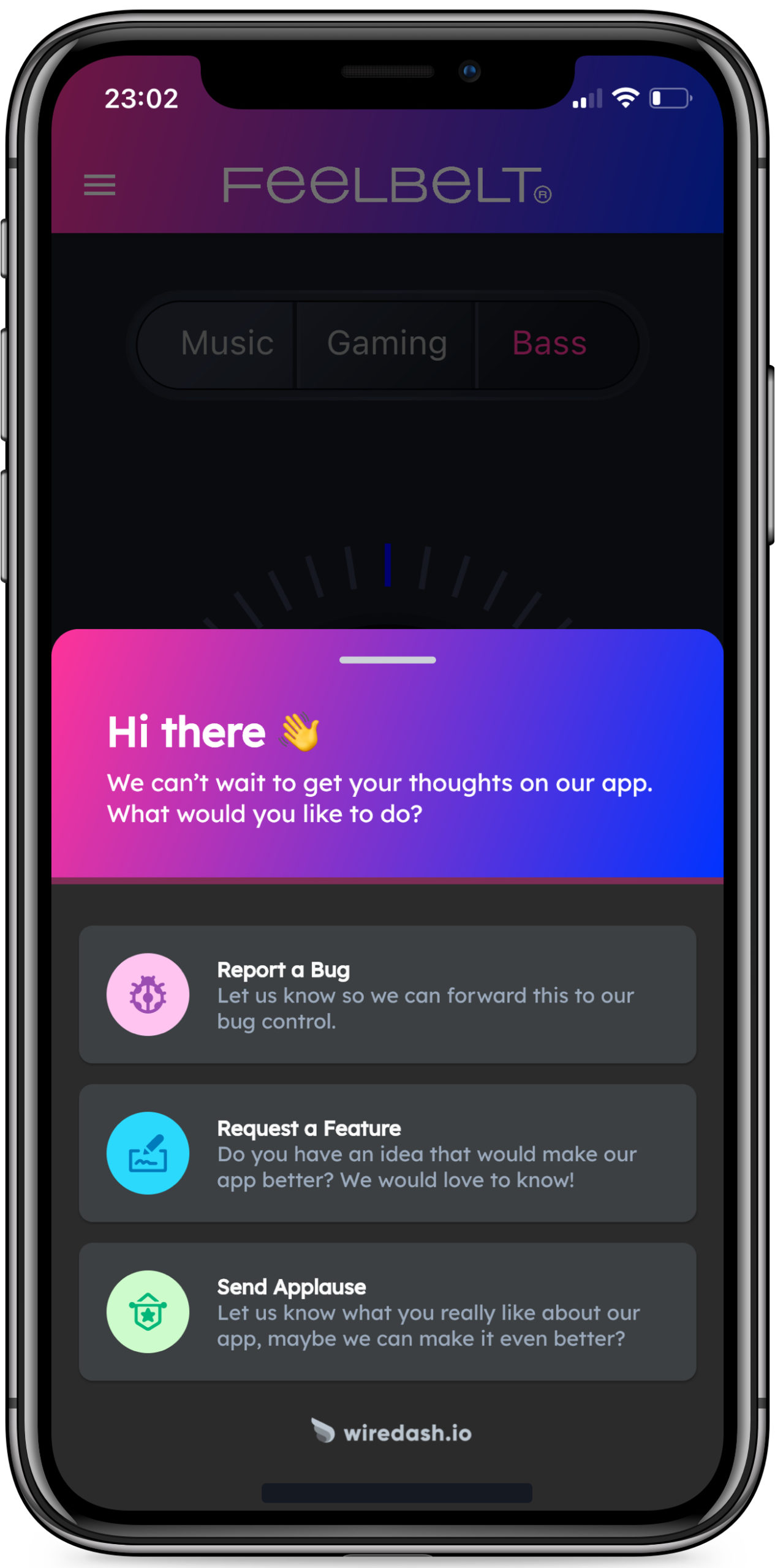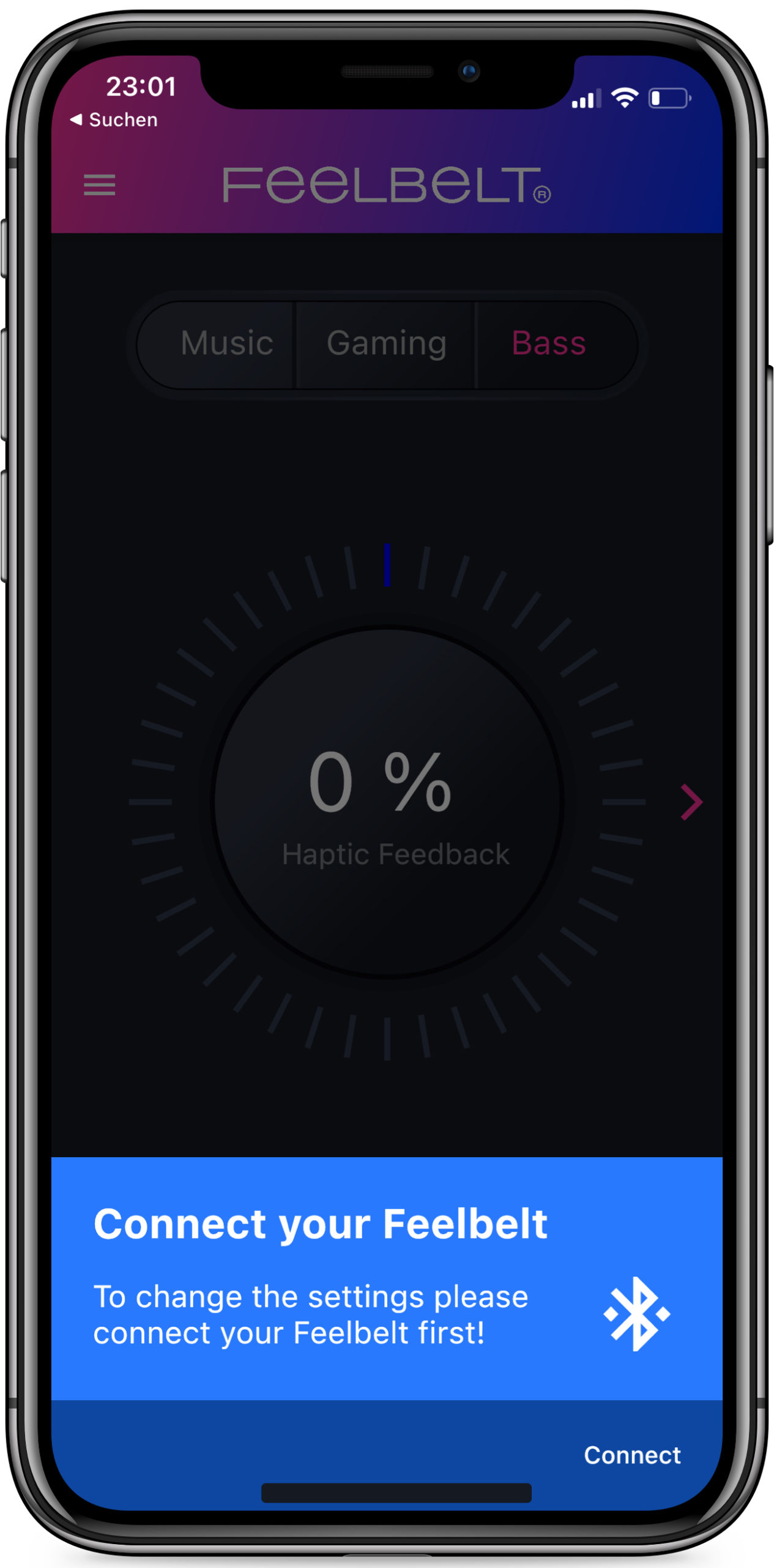 Feelbelt ist ein revolutionäres, neues Gadget, mit dem wir Musik und Handlungen in Videospielen und Filmen mit einer nie dagewesenen Intensität erleben. Mit unserer App können Sie zwischen Musik-, Spiel- und Bassmodus wechseln, um ein optimales Erlebnis zu erhalten. In jedem Modus können Sie Ihre Einstellungen für die Lautstärke und die Stärke des haptischen Feedbacks wählen.
