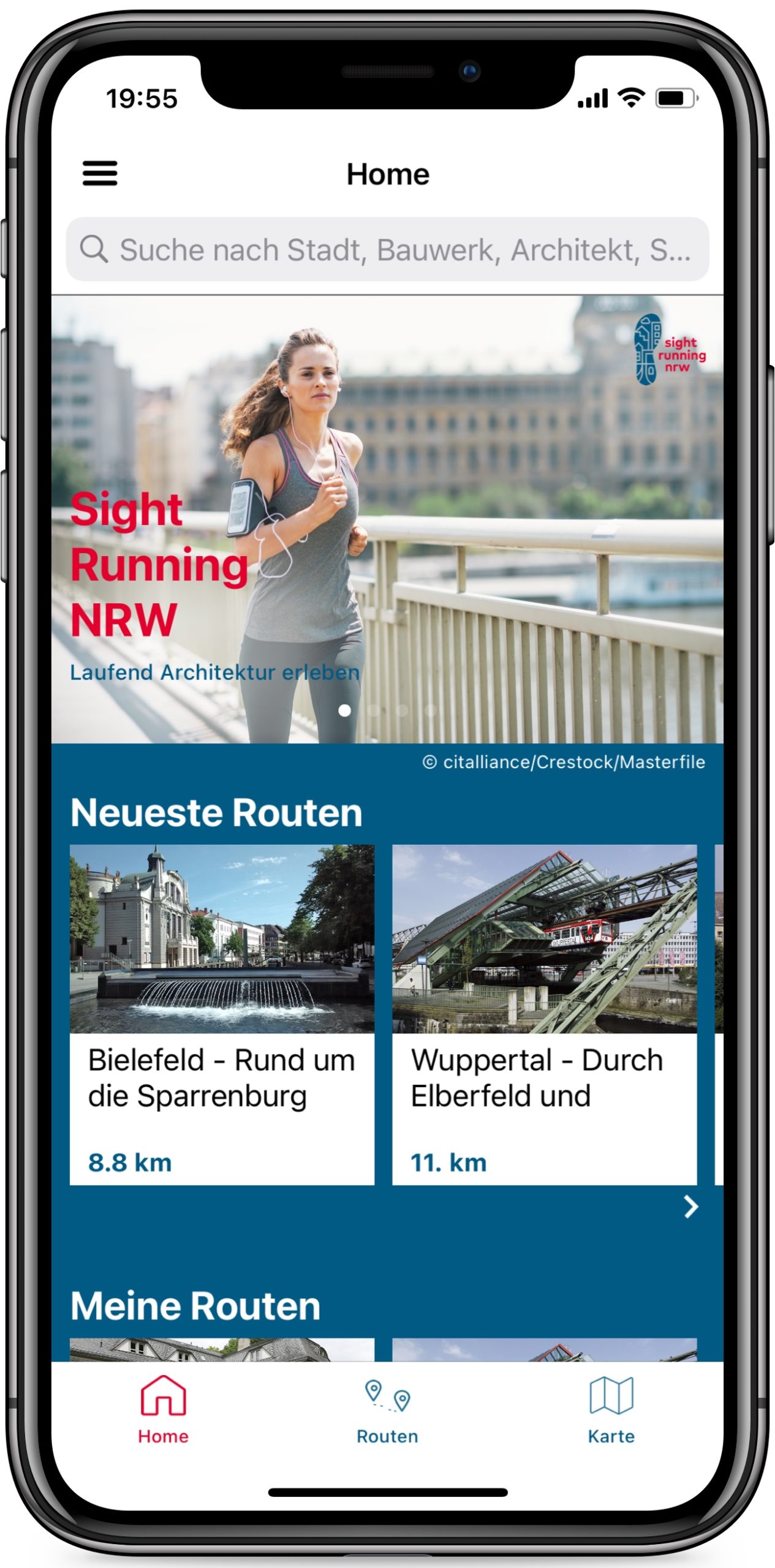 Mit „Sight Running NRW“ werden Laufinteressierte, Radfahrer und Inlineskater auf baukulturelle Highlights durch Audiodateien aufmerksam gemacht. Der User erhält, wenn sich einem Objekt nährt detaillierte Informationen zum Bauherren, Architektur und Baujahr.