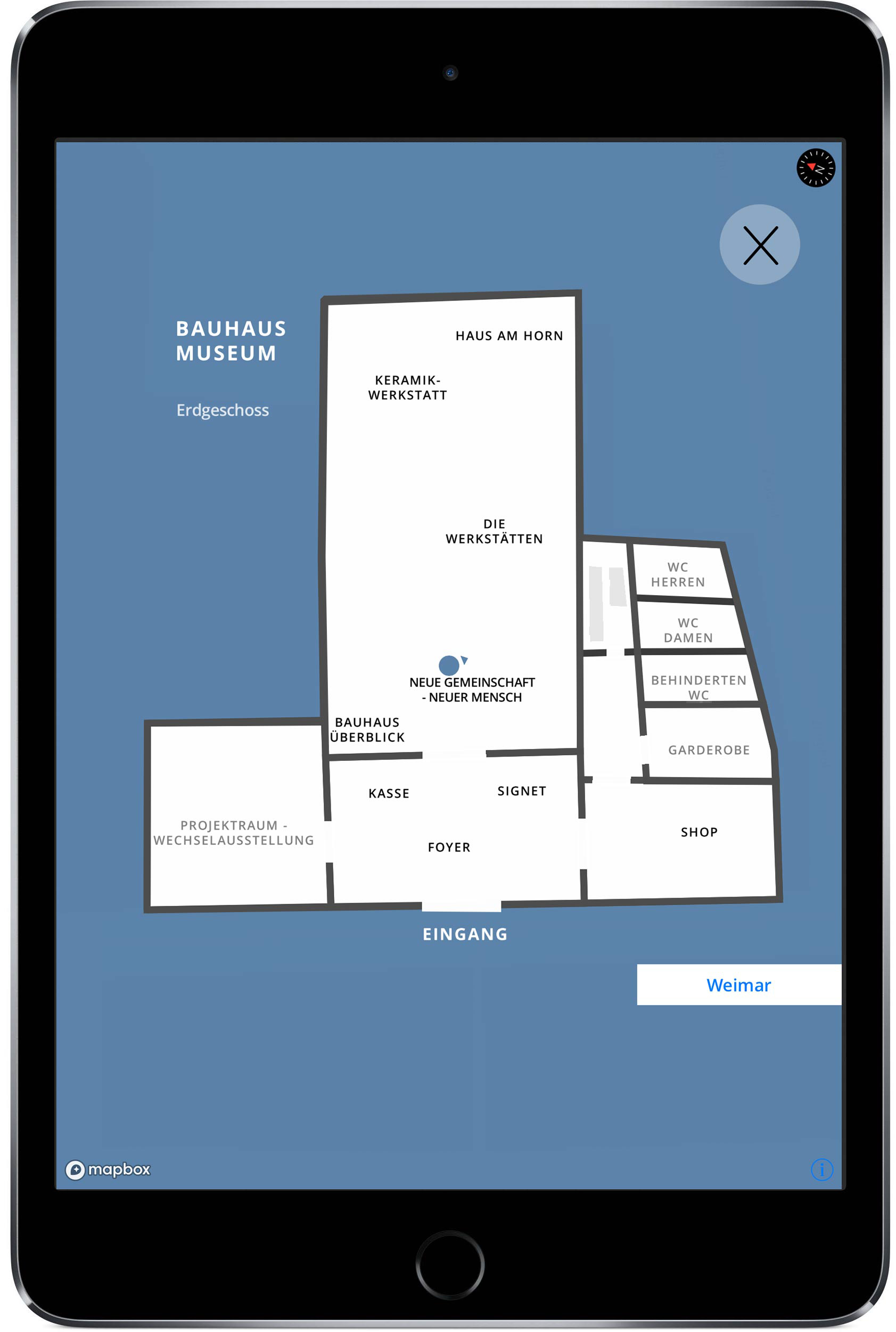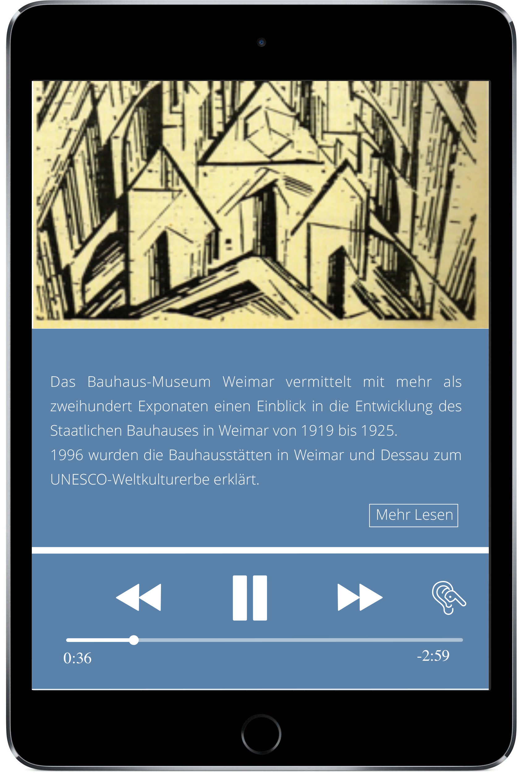 Der Medienguide begleitet den Besucher durch das Bauhaus Museum Weimar anhand einer intuitiven Orientierung, am Ort des Interesses erhält der Besucher multimediale Inhalte. Die Besucher erleben die Exponate in einer linearen Reihenfolge.